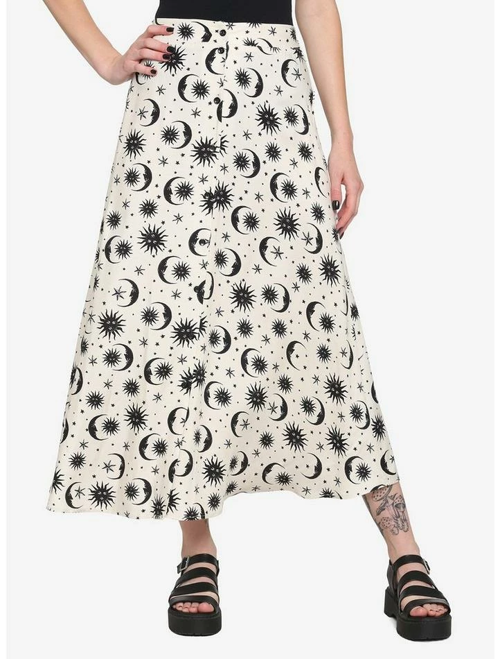 Get among the stars with this ivory and black celestial print skirt featuring a front-button closure and midi length.ย
