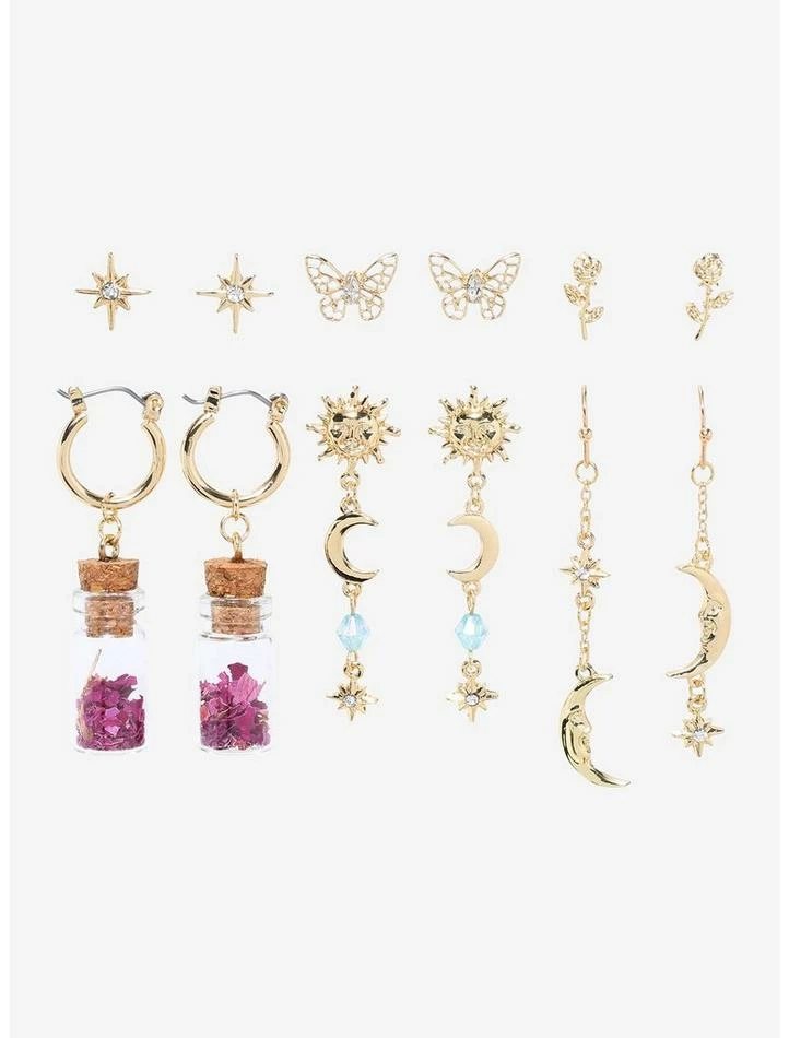 Add some romantic celestial vibes to your outfit with this set of earrings! Elevate your look with these gold-tone studs of stars, butterflies and roses, plus drop earrings filled with celestial charms and a pair of mini hoops with dried floral pieces in a corked jar.