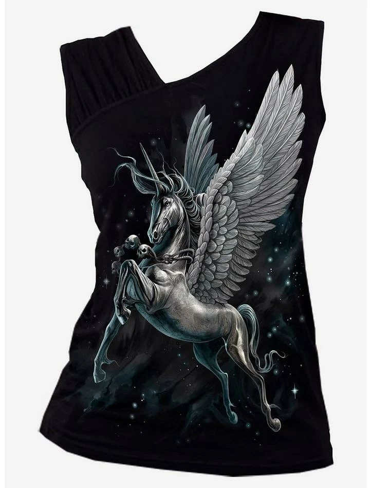 The form of a mystical winged Unicorn, galloping beyond the known Astral Plane and up into the star-flecked Beyond. Her mane, entangled with the void surrounding her, reflects the light from the moon while her platinum body shines effervescent amongst ever-encroaching Dark Matter. A beacon of hope shining in the blackest depths of despair. This Gathered Shoulder Sleeveless Top is made of viscose elastane jersey using skin friendly, Azo-free, reactive dyes.