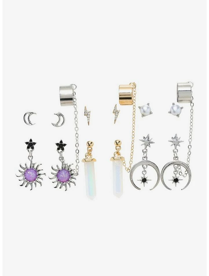 Add a mystical touch to your look with this gorgeous earring set! Featuring celestial-themed stud and cuff earrings, adorned with opalescent and faux crystal accents.