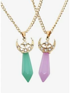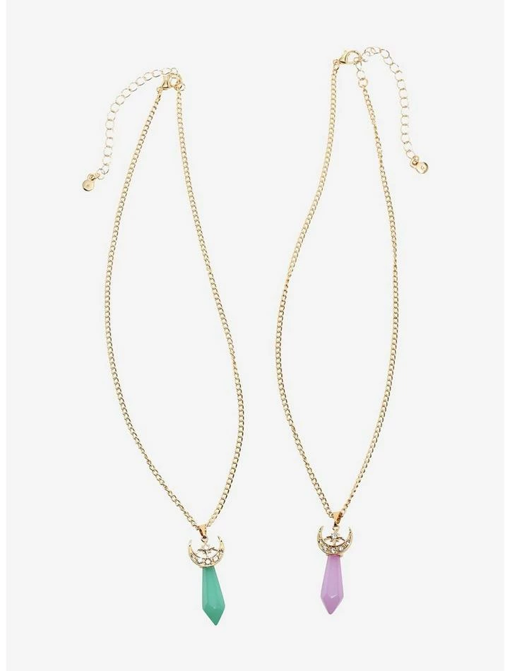 Got a bestie who’s out of this world? Make sure you both sparkle brighter than the night sky with these matching necklaces! Featuring different faux crystals both encased in a gold-tone crescent moon and star design, filled with sparkling faux gems.