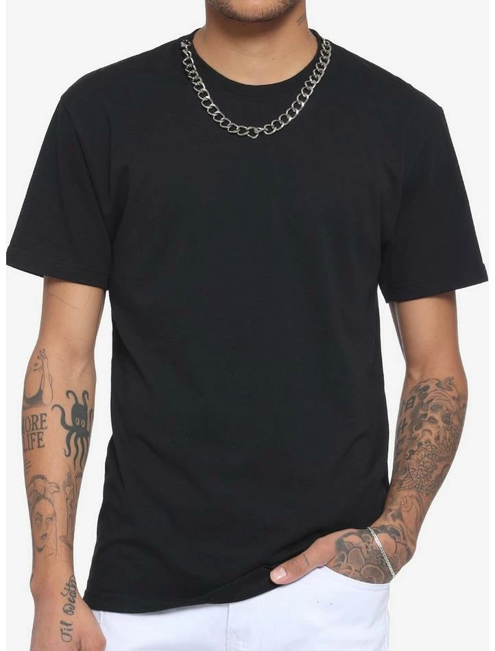Want to add a little something to your plain shirt game? This black tee with a silver tone neck chain is the perfect choice!