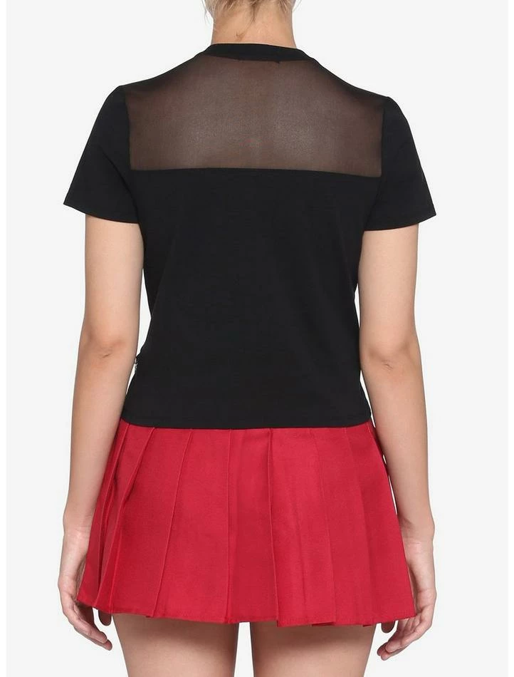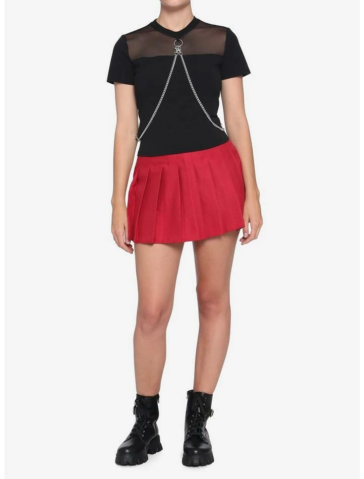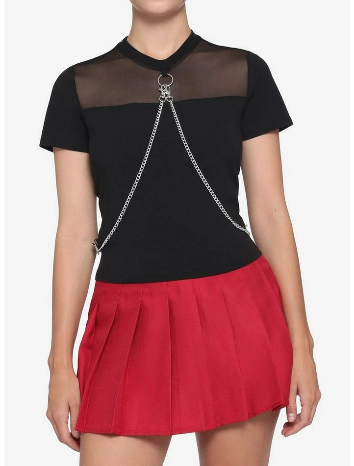 Summer heat bogging down your fashion? Don’t sweat it; we’ve got just the thing. This black cropped tee features a mesh panel and two removable silver tone body chains with O-ring.