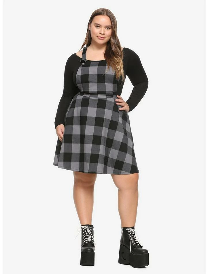 Not sure if you’re feelin’ more like a dress or overalls? How about a skirtall! With an allover charcoal plaid print, you can wear any color underneath. The adjustable straps can be worn straight or crisscross. Features hip pockets and back zipper closure.