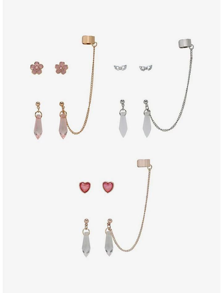 Bring some sweet magic to your earring looks with this cherry blossom-inspired earring set. Featuring studs with cherry blossoms, wings and hearts andΒ crystal point-style drop earrings with chain cuffs.