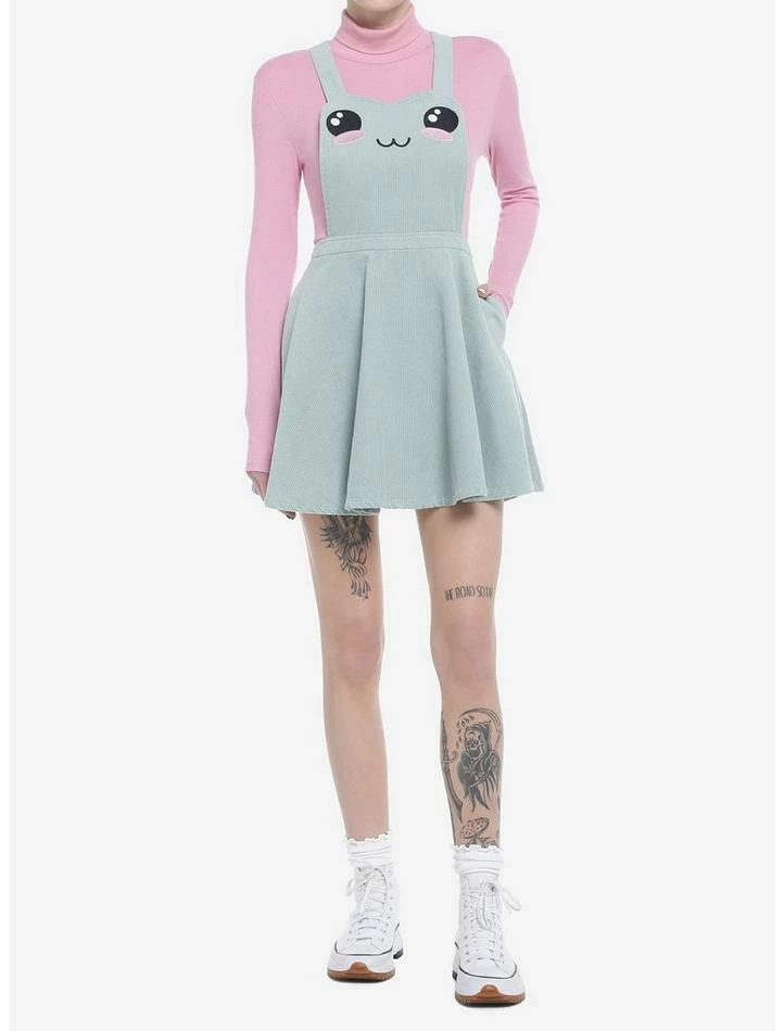 Need a new skirtall? We froggin’ got you! This corduroy number is embroidered with a chibi frog’s smiling face on the front. It also has pockets and adjustable straps.