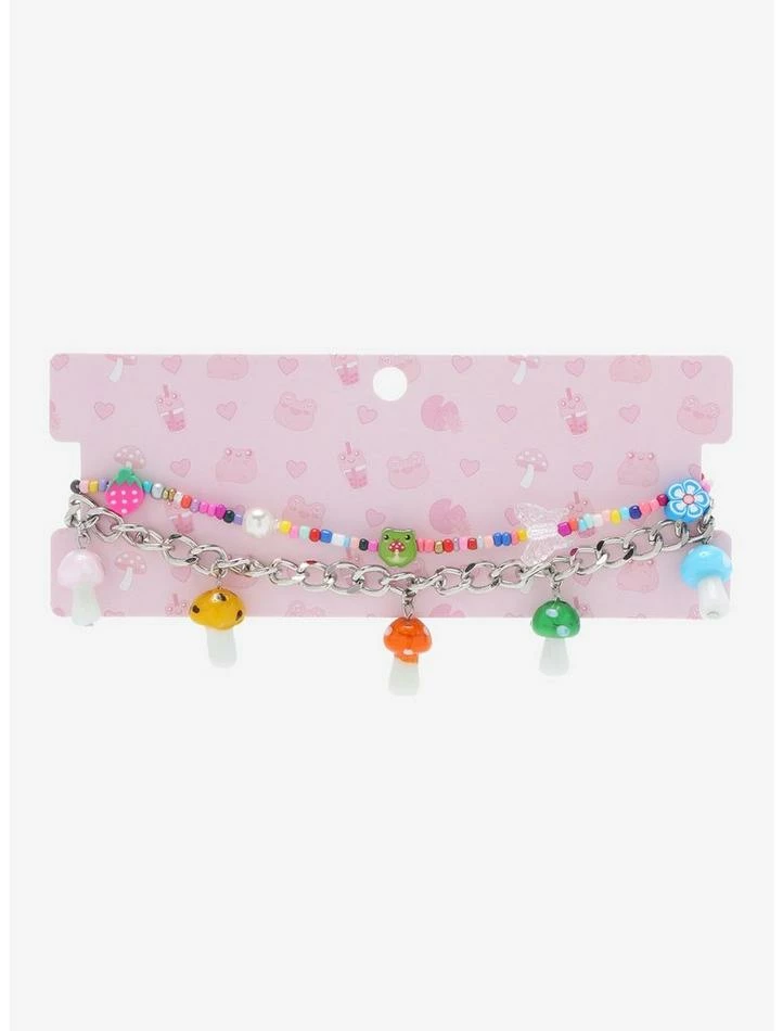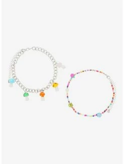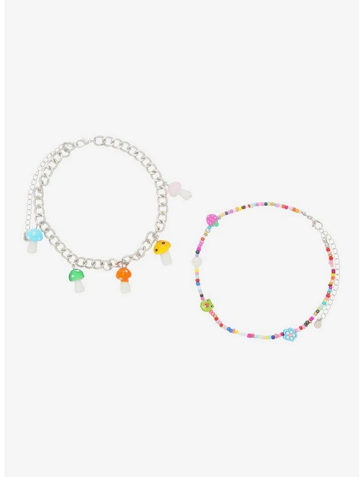 Layer these colorful chokers together for a toad-ally cute look! This necklace set comes with a colorful beaded choker with statement charms throughout, like frogs, strawberries and more! The second silver tone chain choker comes with multicolor mushroom charms.