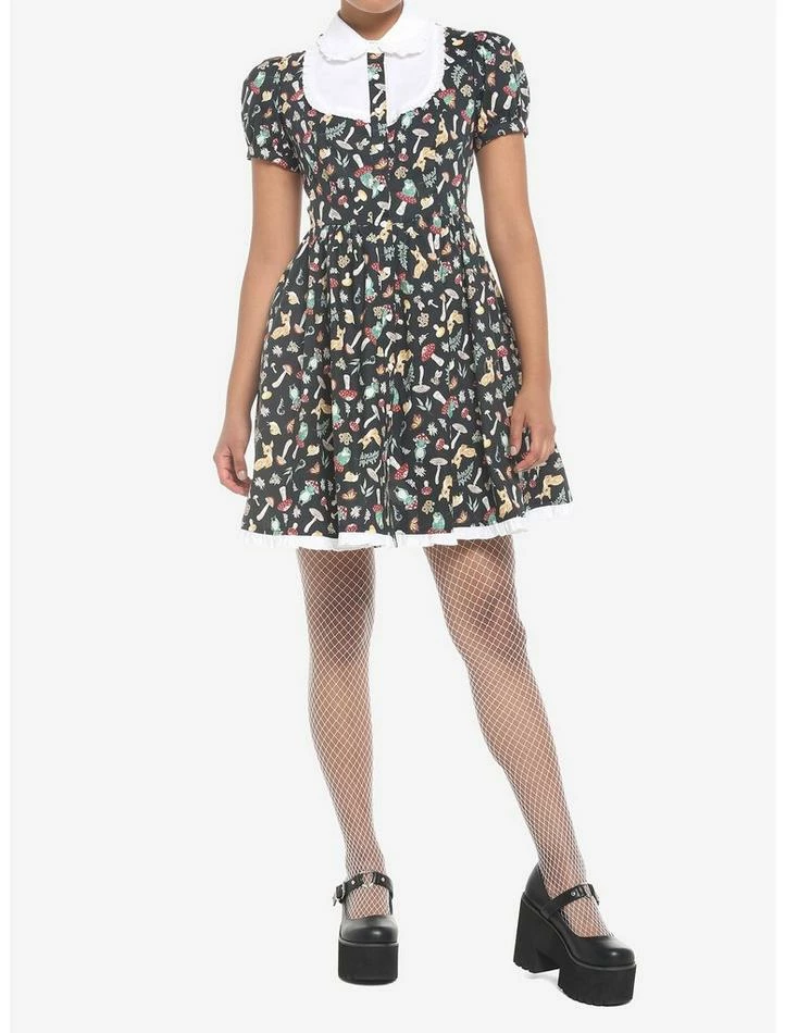 Feel one with nature when you wander around in this new dress! This black cottagecore dress features an allover print of forest flora and fauna. Comes with a contrast white peter pan collar and bib detailing up top, white heart-shaped buttons down the center and white ruffle detailing at the skirt. Complete with puffed sleeves and pockets.