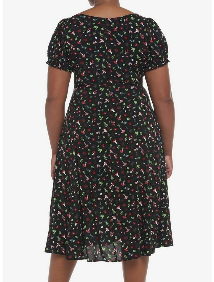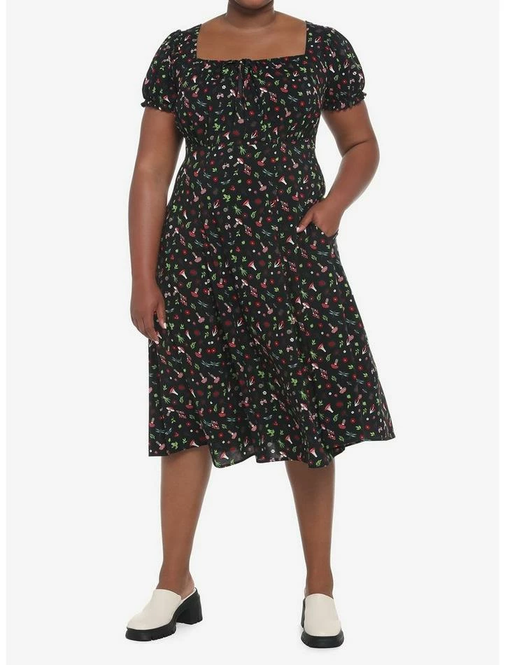 Get ready to wander into the forest with style! This black empire midi dress is perfect for any cottagecore look. Features an adjustable tie front, puff sleeves, pockets and slip lining.