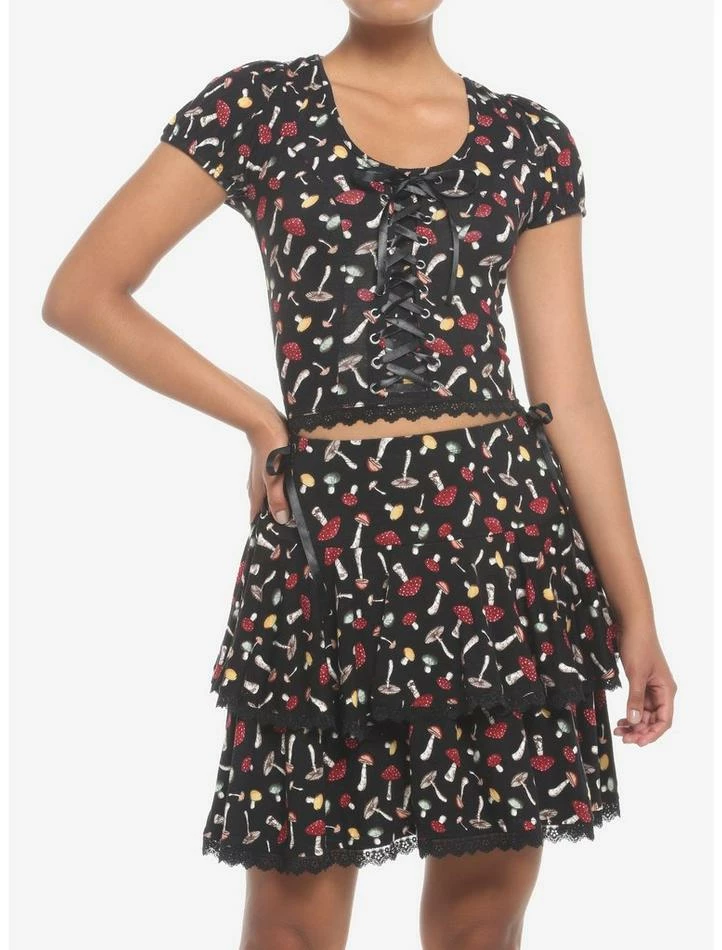 Feel one with nature when you wander around in this new top! This black cottagecore piece features an allover print of forest flora and fauna. Comes with black ribbon lace-up detail down the center and a black lace trim. Complete with princess seams and elasticated sleeves. Pair with the matching skirt for the full cottagecore look!