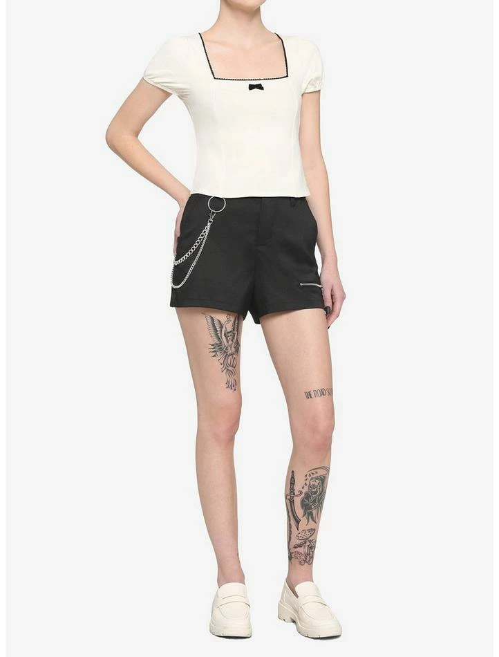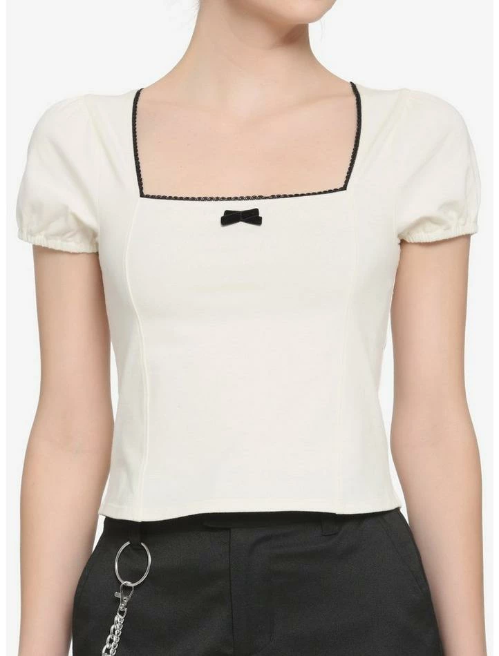 Bring a classy touch to your wardrobe with this simple top! Dress up any look with this cream top, featuring a square neckline with dainty black lace trim, plus elasticated puffy sleeves and princess seams. Tie it all together with the delicate velvet bow in the center!