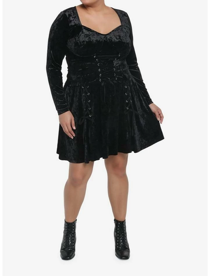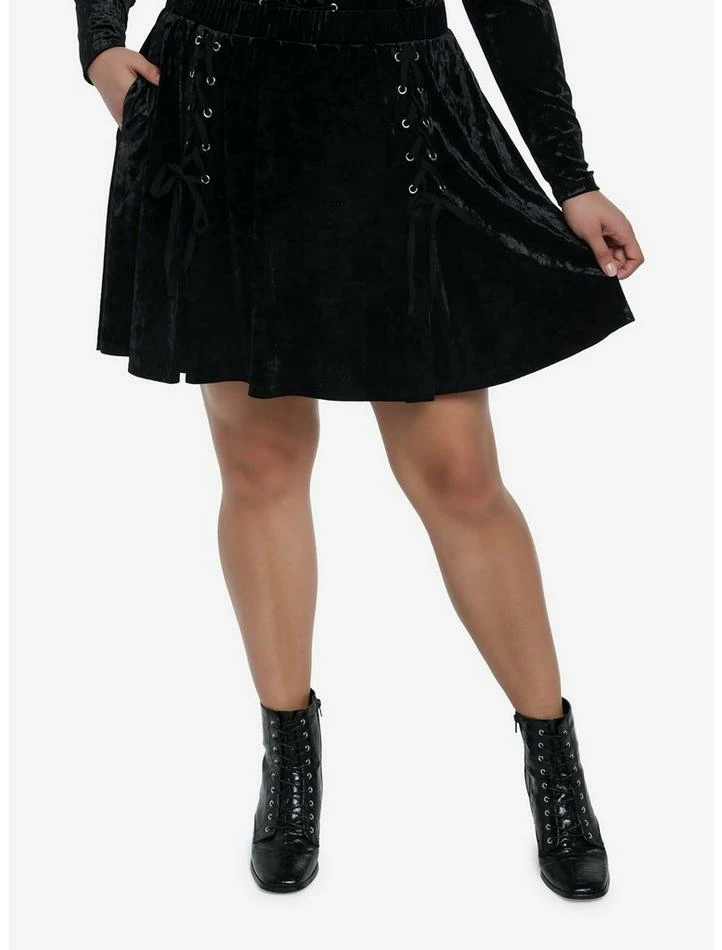 Lace up your look with a classy new skirt! This crushed black velvet skirt features lace-up details on the front, and is complete with pockets and stretchy waistband. The perfect skirt for your bewitching outfit!