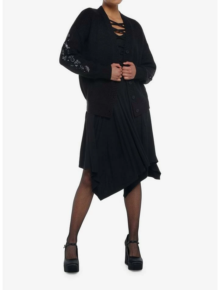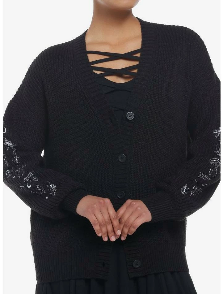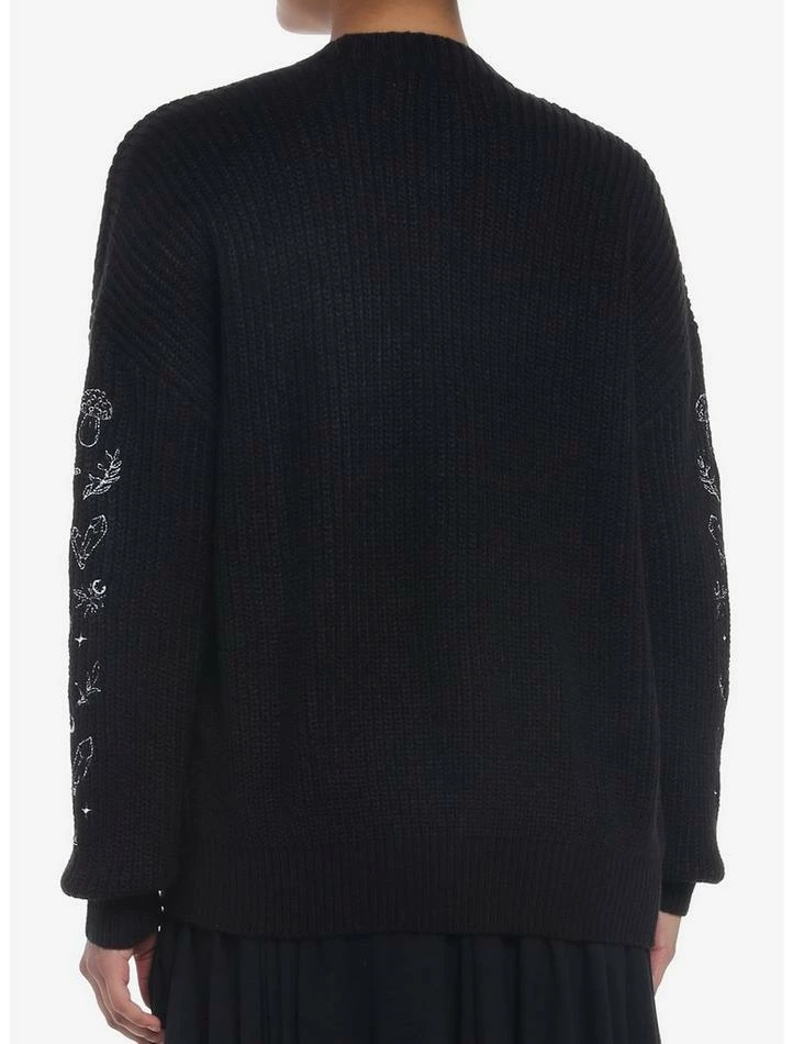 Crystals, foliage, insects and mushrooms are an entire vibe. If they describe your likes and loves, this oversized cardi is perfect for you. Its sleeves are embroidered with your fave dark cottagecore symbols.