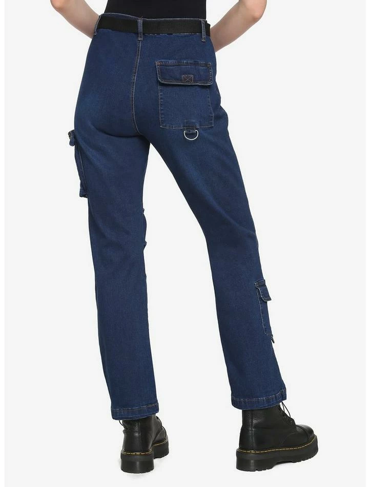 Add a dark wash, cargo-style pair of denim to your outfit rotation for a streetwear look! This pair of dark indigo denim pants has the classic stitching for a cargo-styled look, with rips at the knees for extra edge. Comes in a straight leg silhouette with utility pockets on both legs, plus a removable black utility canvas belt. Cinch the leg openings to your liking with the elastic drawstrings at the ankles!