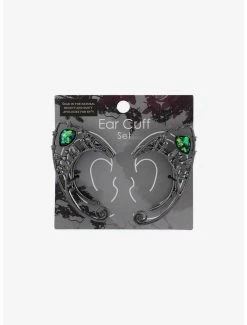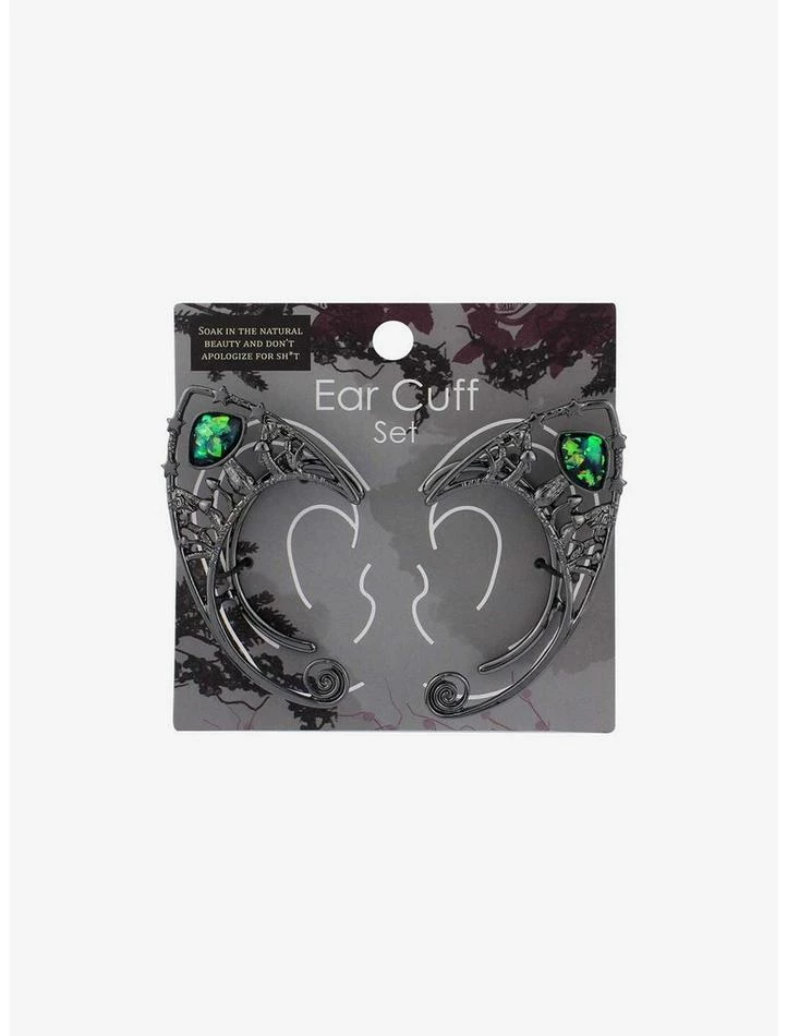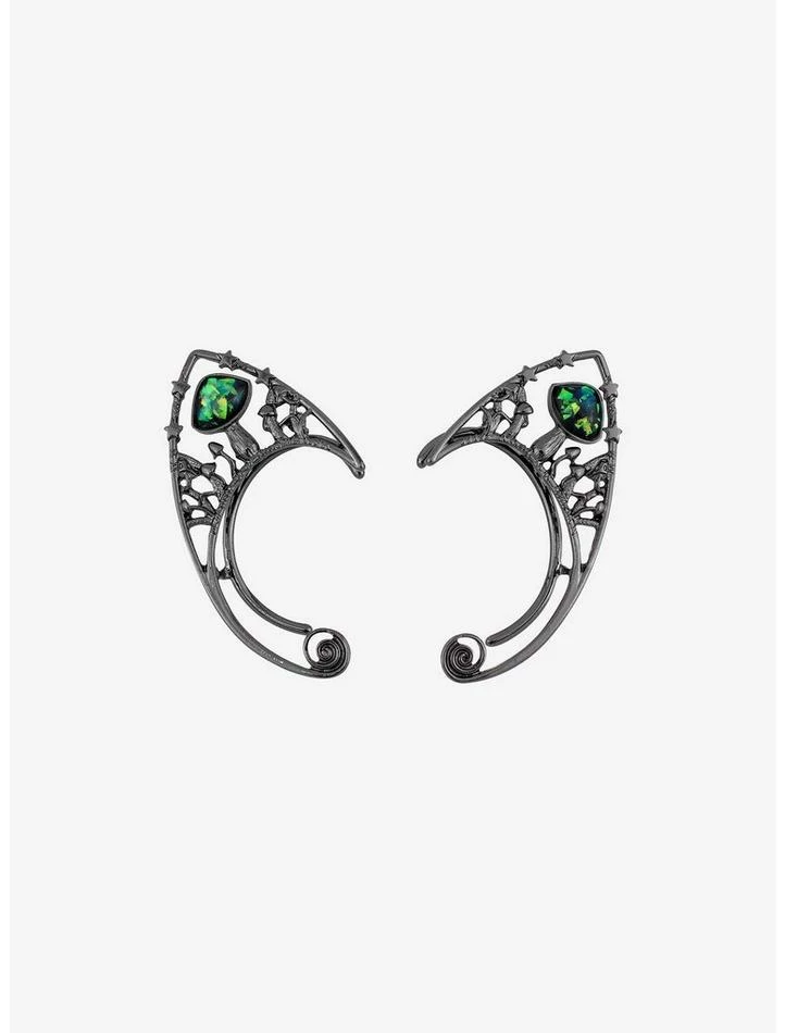 Take your mystical look to the next level with these ear cuffs! This gunmetal-toned ear cuff set will have you looking as ethereal as a fairy, with sharpened ears and black opalescent mushroom details on the inside.