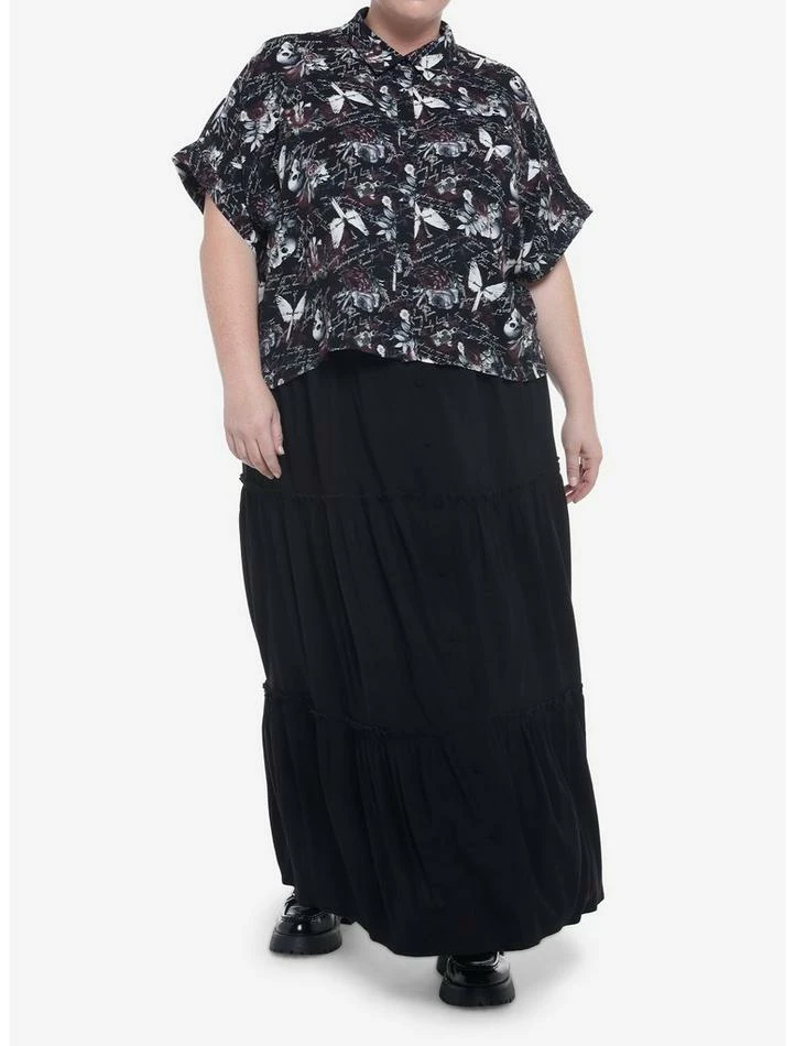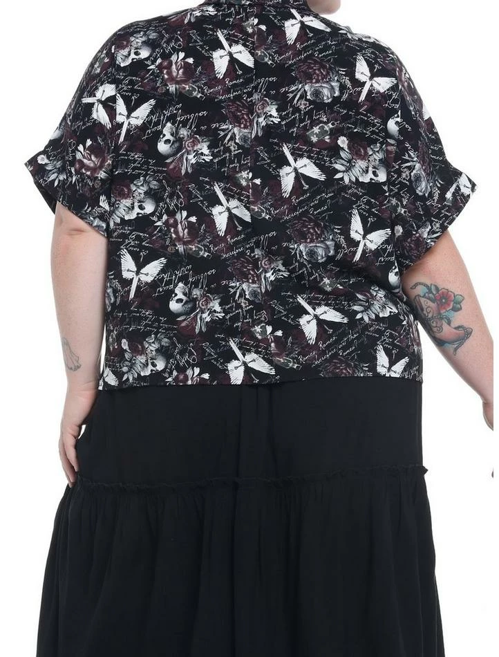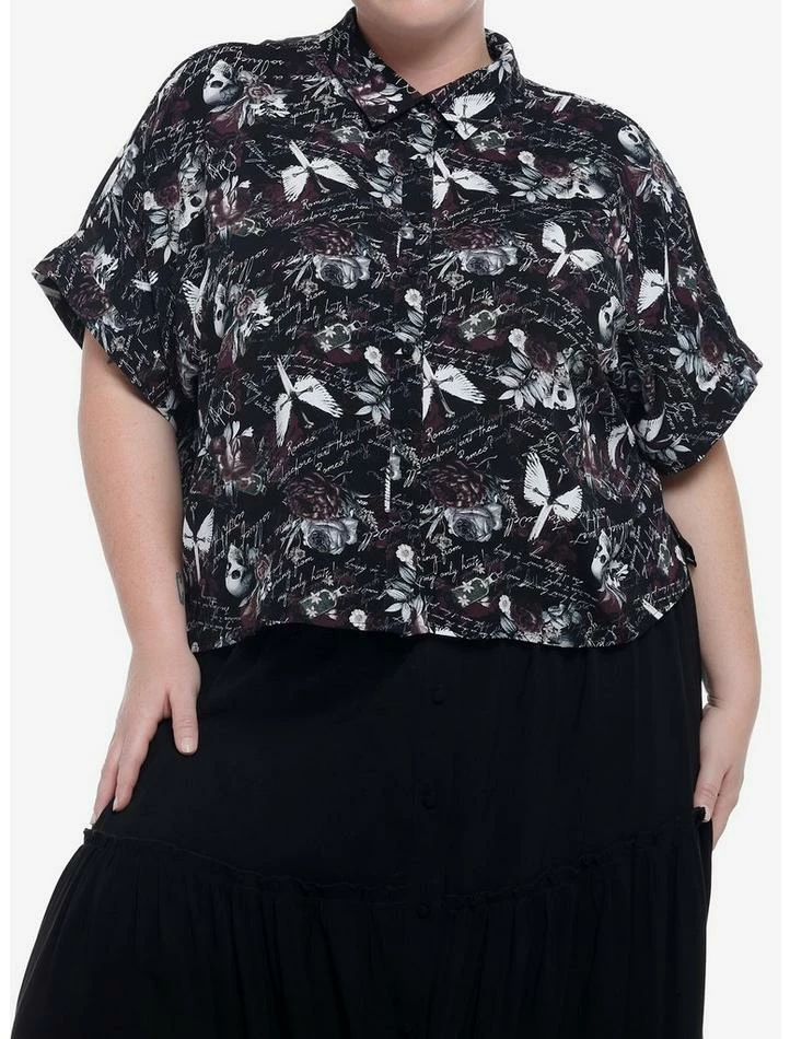 Need a top that screams, “Parting is such sweet sorrow”? We’ve got the perfect dark romance woven button-up for thee! This boxy top features an allover print of quotes in script font, plus dark icons of skulls, roses, daggers and more.ย