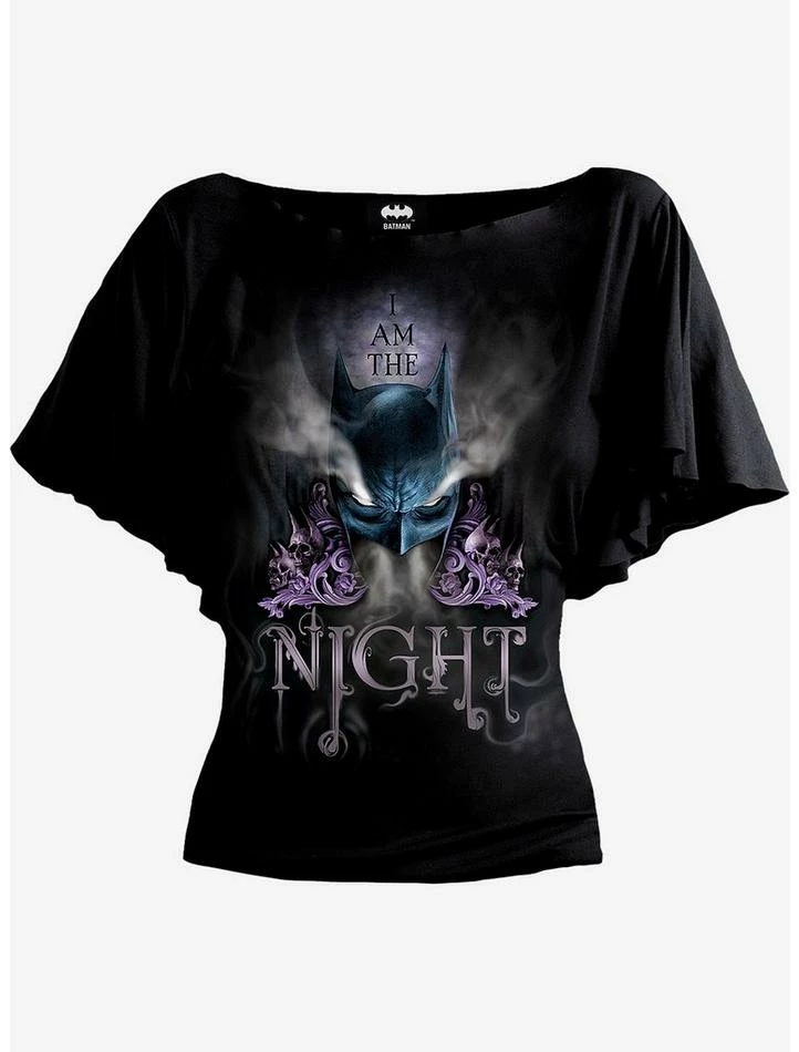 One of Batman’s most iconic phrases is emblazoned across the front of a design that is equal parts gothic and elegant. Boat Neck Bat Sleeve Top Black is made of viscose elastane jersey using skin friendly, Azo-free, reactive dyes.