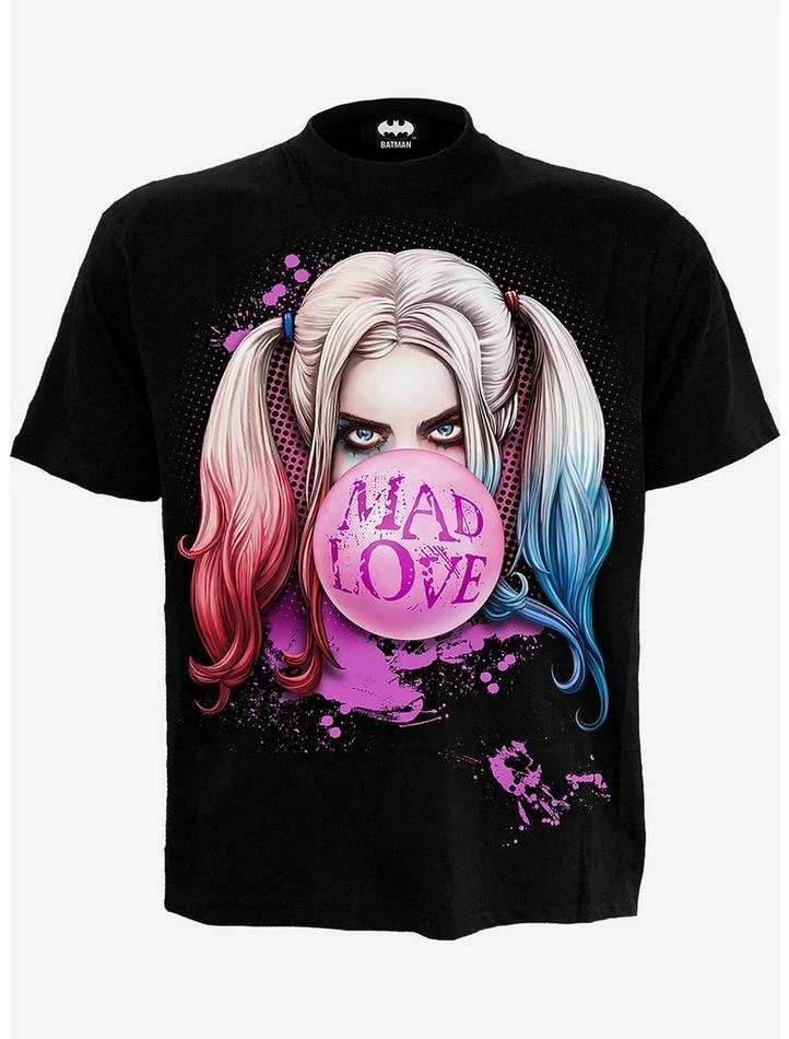 The piercing eyes of Harley Quinn are unmistakable with their smeared streaks of eyeshadow, and her dip-dyed pigtails frame a huge pink bubble gum logo. This T-Shirt is made of top quality cotton jersey using skin friendly, Azo-free, reactive dyes.