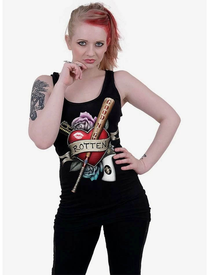 A beautifully rendered tattoo-style heart with a very familiar baseball bat and two ombre roses in the colours of Harley’s pigtails. This racer back tank top is made of top quality cotton fine combed using skin friendly, Azo-free, reactive dyes.