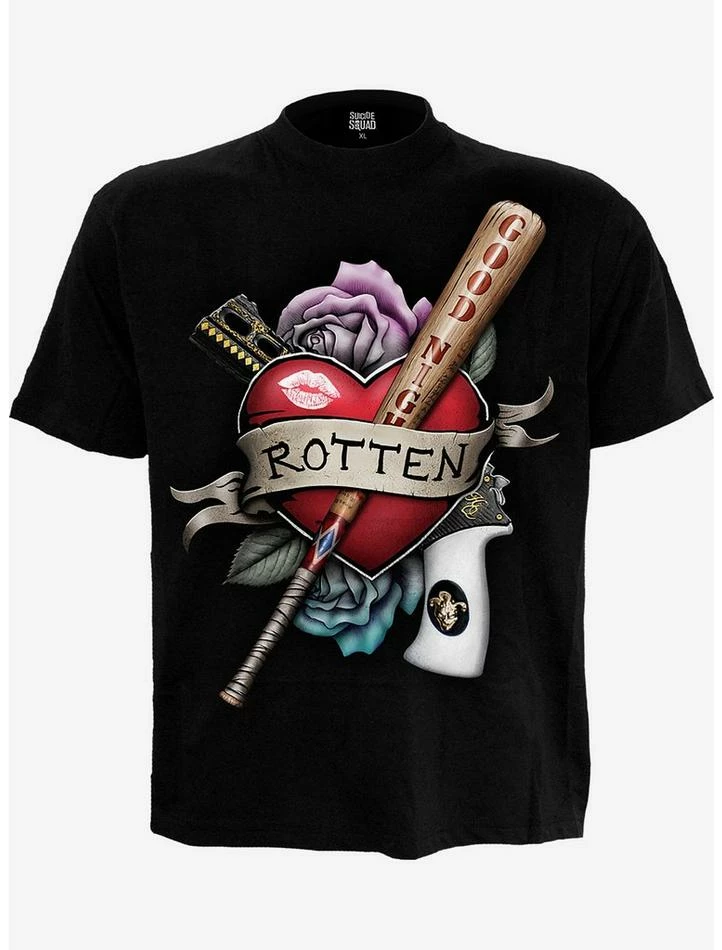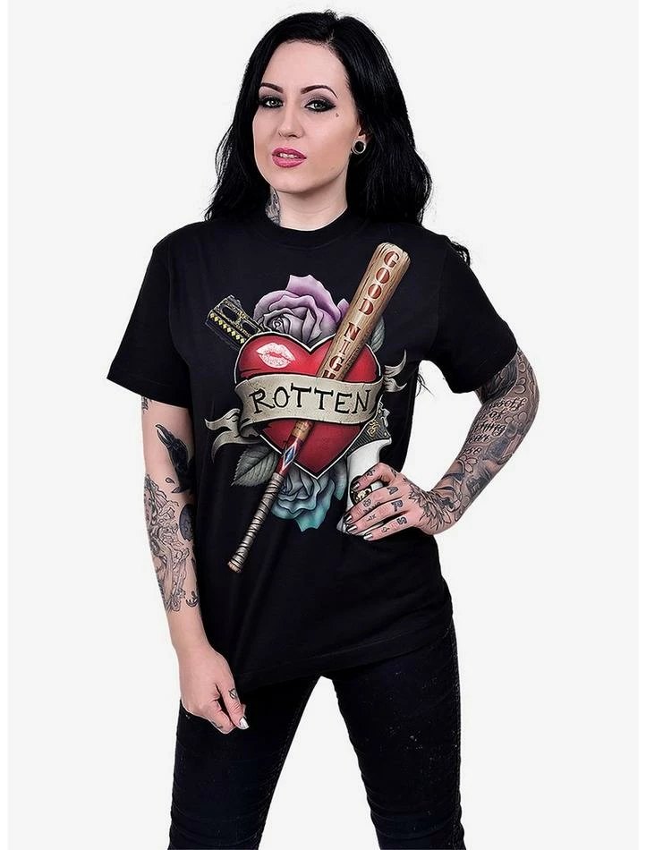 A beautifully rendered tattoo-style heart with a very familiar baseball bat and two ombre roses in the colours of Harley’s pigtails. This T-Shirt is made of top quality cotton jersey using skin friendly, Azo-free, reactive dyes.