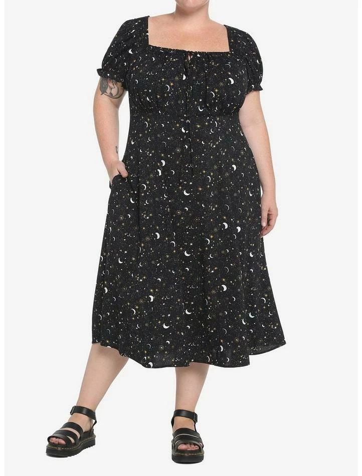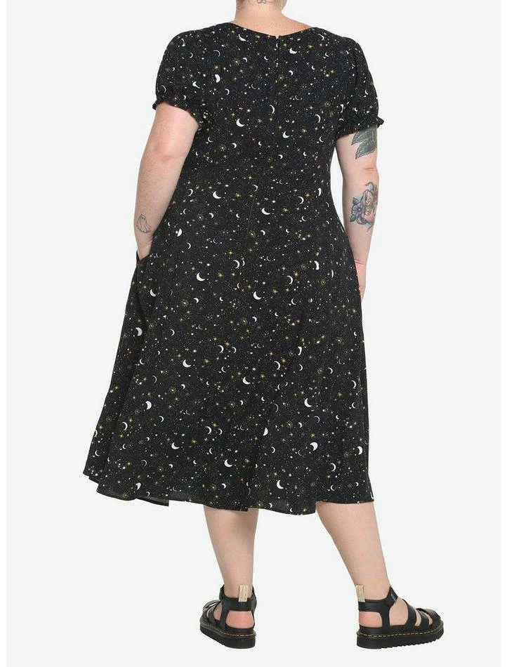 Channel the beauty of the moon in this black dress featuring a ditsy celestial print, puff sleeves, drawstring tie on the neckline, midi length and back zipper closure.