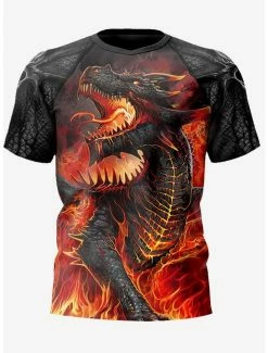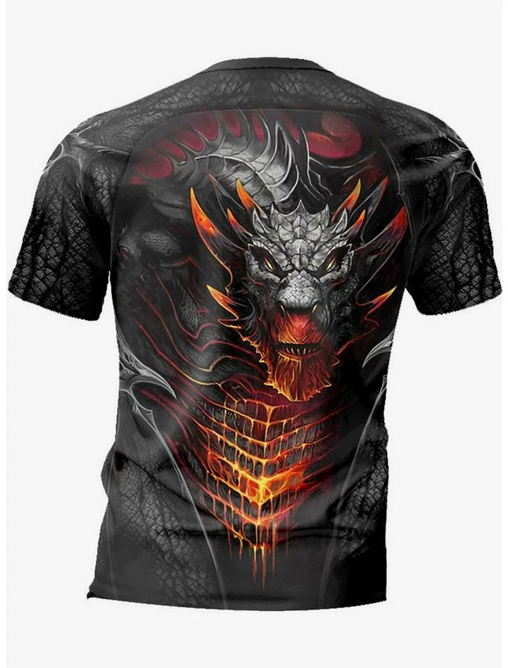 Wings of charred sulphur envelope the suffocating heat burning from within this dragon’s belly. Molten lava seeps from every crack along her body, dripping to the ground where furious flames whip and lick at her feet. This Sustainable Shirt is made of recycled polyester jersey using recycled plastics from the ocean.