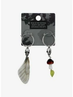 We’ve scavenged the very best the forest floor has to offer and turned it into these earrings. And, as a bonus, we promise they aren’t even haunted! These hoop earrings feature dangle charms of silver tone skulls, a dragonfly wing, a mushroom and a leaf.