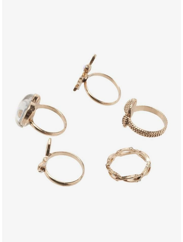 We’re channeling allΒ the dainty forest vibes with this ring set! Add a bit of class to your cottagecore look with these gold-tone rings, featuring a statement domed heart piece with dried florals inside, an intricate fairy holding a pearlescent gem and more!