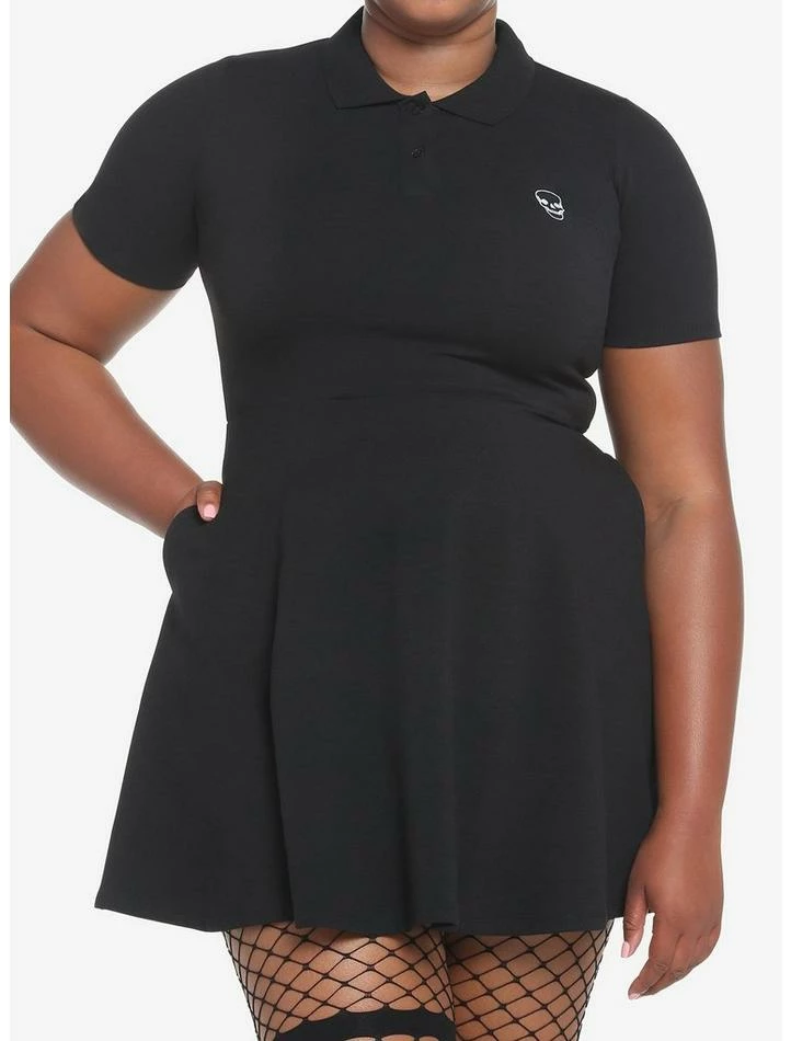 Add some edge to a charming silhouette. This black polo dress features side-seam pockets, a button front and an embroidered skull at the left breast.