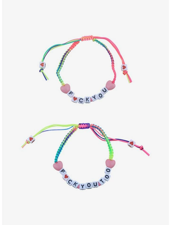 You and your bestie are full of attitude. This bracelet set features two colorful cords with “F*ck you” and “F*ck you too” letter and pink heart beads.