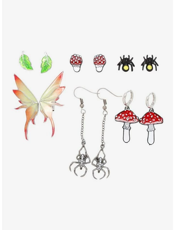Feel magical in this set by Fairies by Trick featuring leaf, mushroom and spider stud earrings, a pair of fairy wings, a pair of silver tone hoops with dangling mushrooms and a pair of fishhook insertion earrings with spiders on chains.