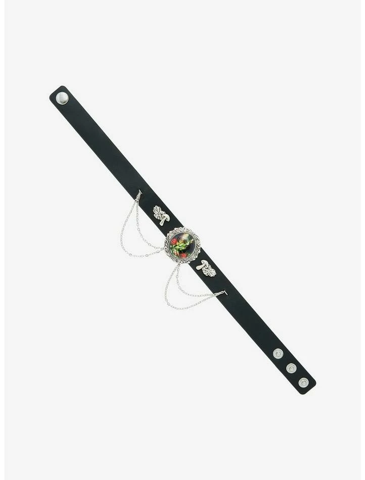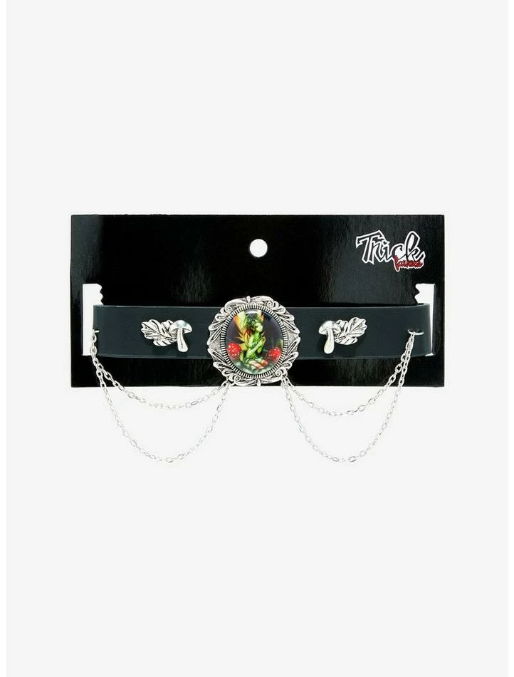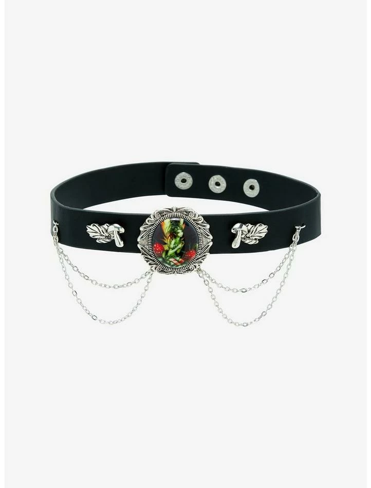 Keep your jewelry collection magical with this fairy cute choker! This faux leather choker features a portrait of a mushroom fairy, with embossed mushroom charms on either side and silver-tone chains draped down the front for a layered look. Comes with adjustable snap button closures on the back.