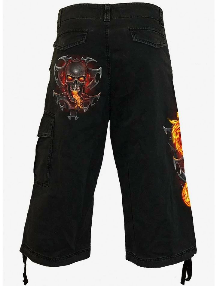 Summoned from beyond, the fiery spectre of a long-dead dragon slithers its way out of the engraved skull on a metallic tribal talisman. These long vintage cargo shorts are made of top quality cotton denim.