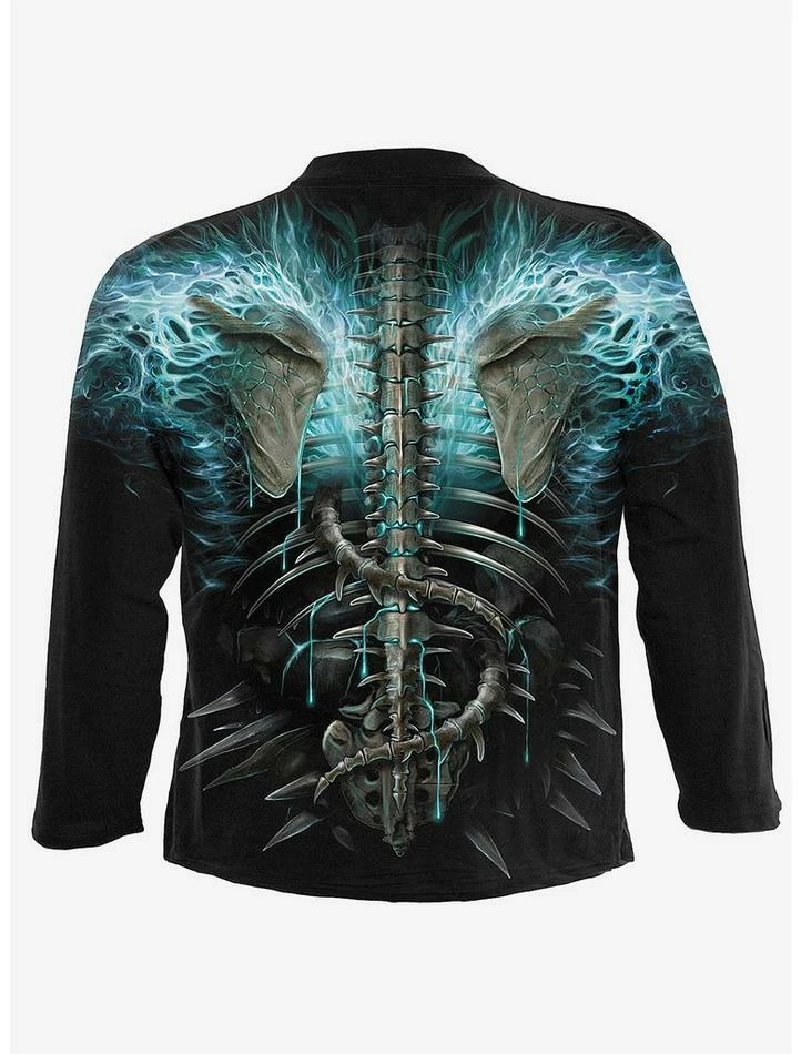 Skulls, spines and bone, dripping in melting lava and blue flames. A fiery all over print. This longsleeve t-shirt is made of top quality cotton, Interlock using skin friendly, Azo-free, reactive dyes.