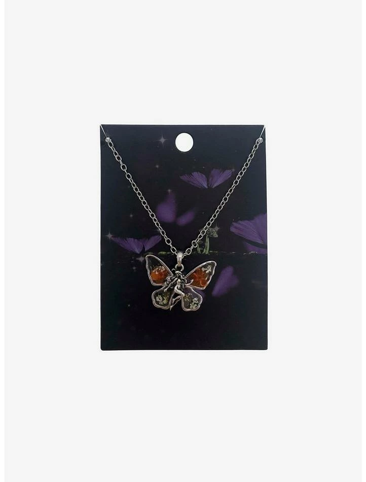 Fancy yourself a forest fairy? Tell the human world with this pendant necklace. Its dark, mystical vibes come from faux dried florals on its wings.