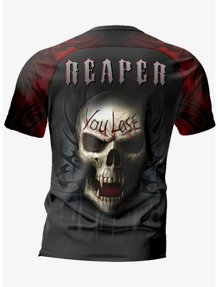 You know it is Game Over if you see this skeleton Reaper with his carved knuckles. This Sustainable Shirt is made of recycled polyester jersey using recycled plastics from the ocean.