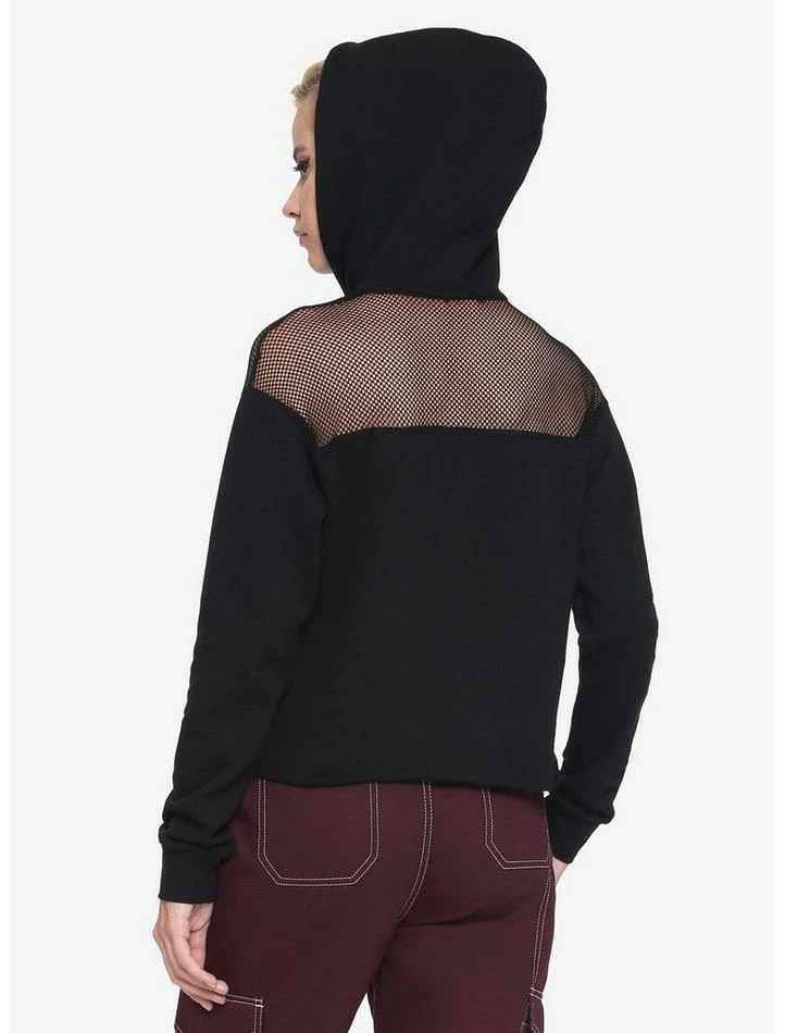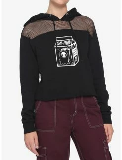 Get your daily dose of vitamin D(eath)! This crop fit hoodie features mesh detailing at top, drawstring hood, and a graphic of “Goth milk” on the chest.