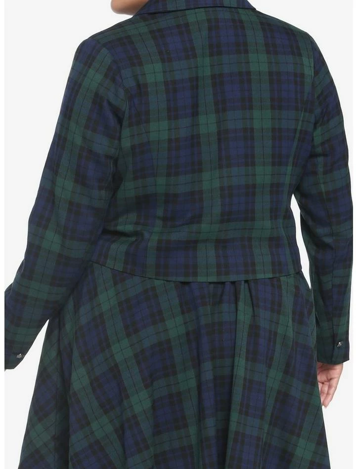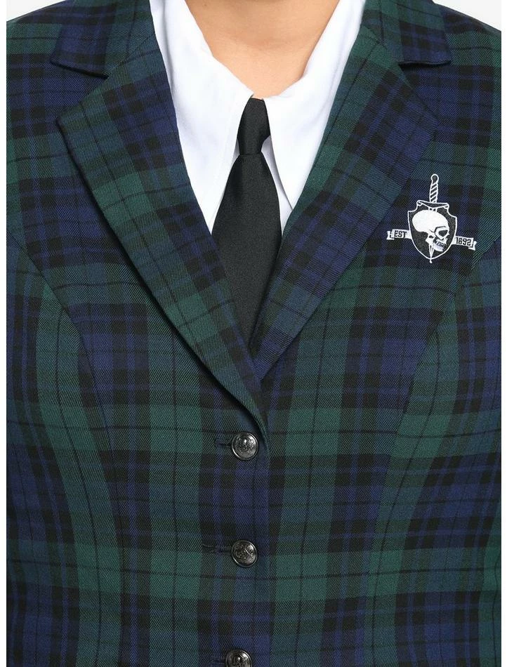 Put some prep in your step with this adorable cropped blazer! Channel your inner preppy vibe with this blue & green plaid blazer, with an embroidered skull crest on the chest, padded shoulders, princess seams for a fitted look and central skull crest buttons at the bottom center. Pair with the matching skirt for the full punk-meets-prep look!