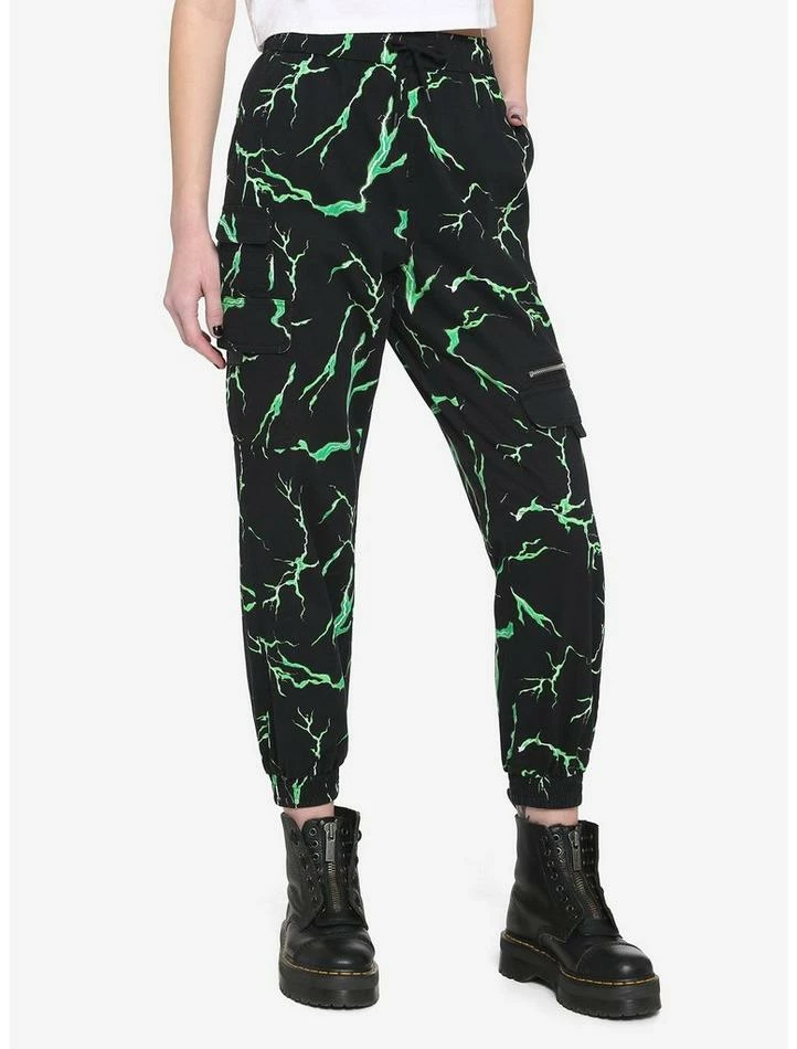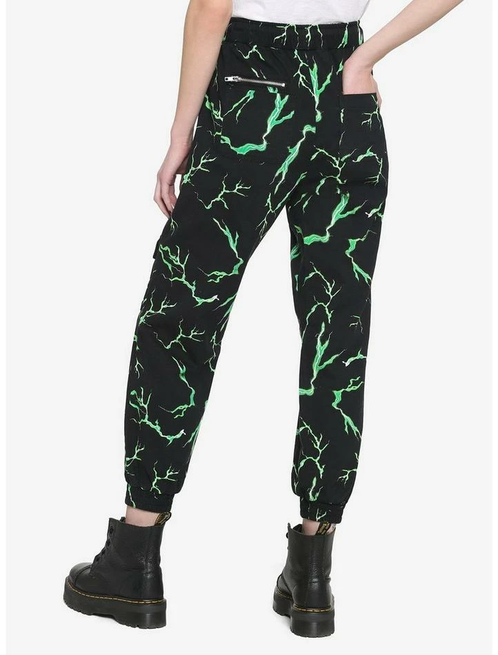 Rock the E-girl look in these black jogger pants! Featuring an allover green lighting print. Comes with several hip, back and leg pockets and zipper detailing. Elasticated drawstring waistband.