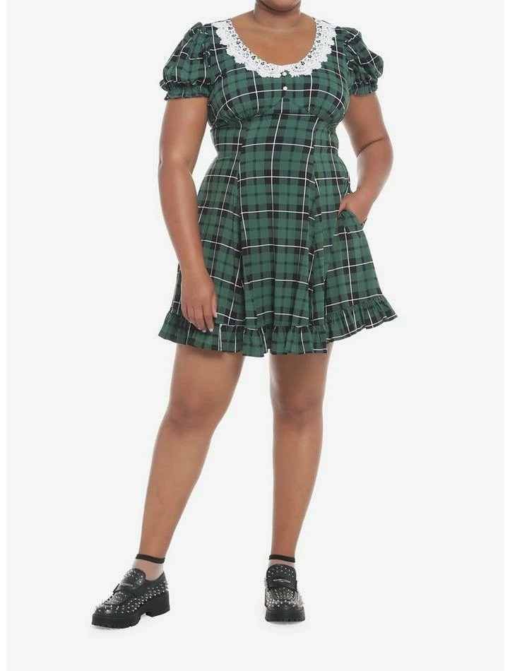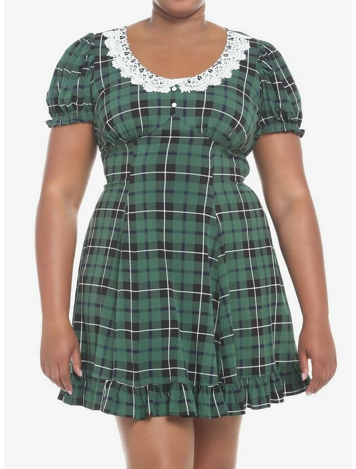 Plaid for the holidays? Timeless! This mini has a skater silhouette with so many details: ruffled hems, gathered seams on the bust, puff sleeves, a bold lace collar and faux pearl buttons.
