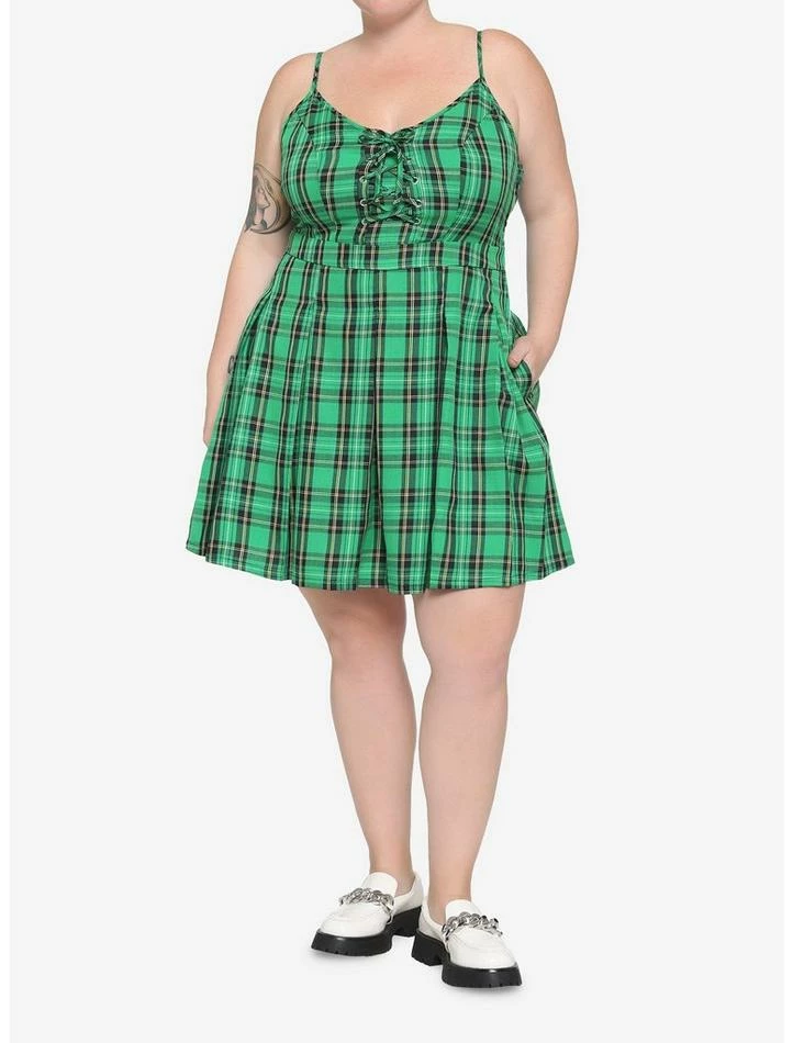 Best Pirce π Green Plaid Pleated Lace-Up π Dress Plus Size π€©