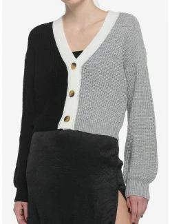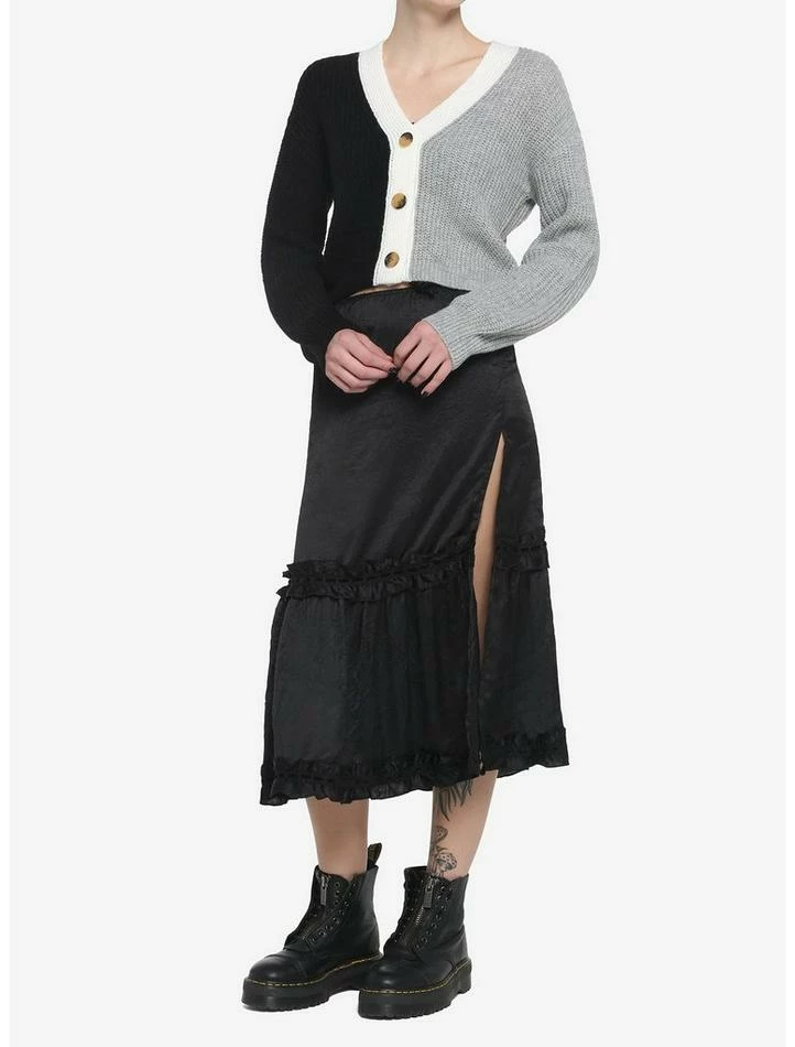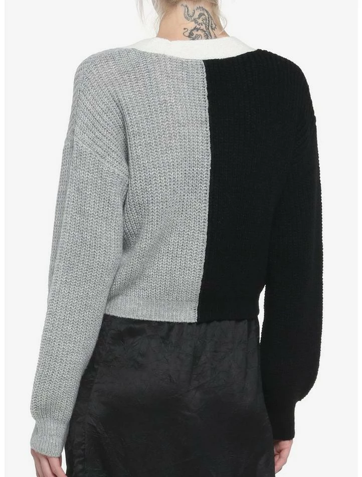 Wanna keep your look monochrome and interesting at the same time? We’ve got you covered (literally) with this cardigan! This adorable cropped cardi features a split design, with one half knit in black and the other in grey. Comes with white contrast detailing down the middle and central buttons.