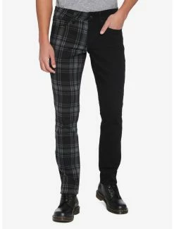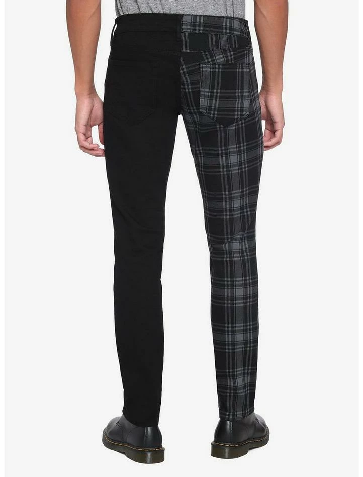 Can’t decide between solids and patterns? Wear both! These skinny jeans feature a grey plaid print leg and a solid black leg. 5-pocket styling with button and zipper closure.