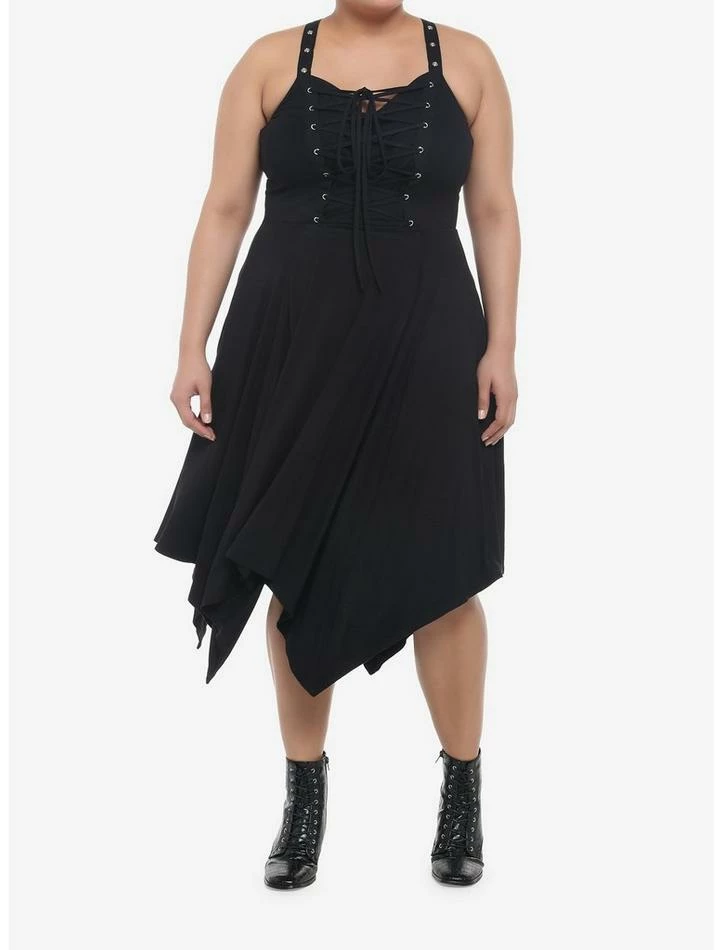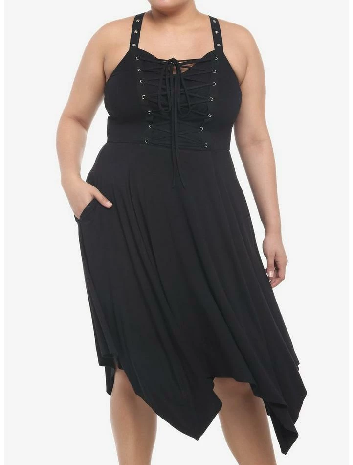 Add some edge to your wardrobe with a brand new black dress! This midi dress features adjustable grommet straps and comes with lace-up detailing across the center chest. Complete with a hanky hem and pockets.