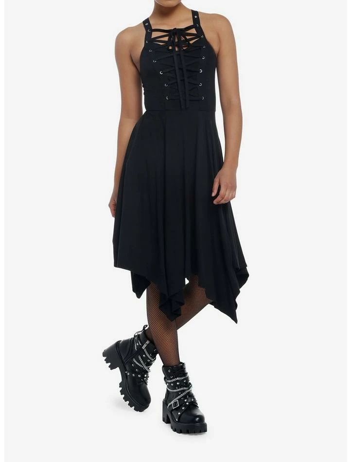 Add some edge to your wardrobe with a brand new black dress! This midi dress features adjustable grommet straps and comes with lace-up detailing across the center chest. Complete with a hanky hem and pockets.