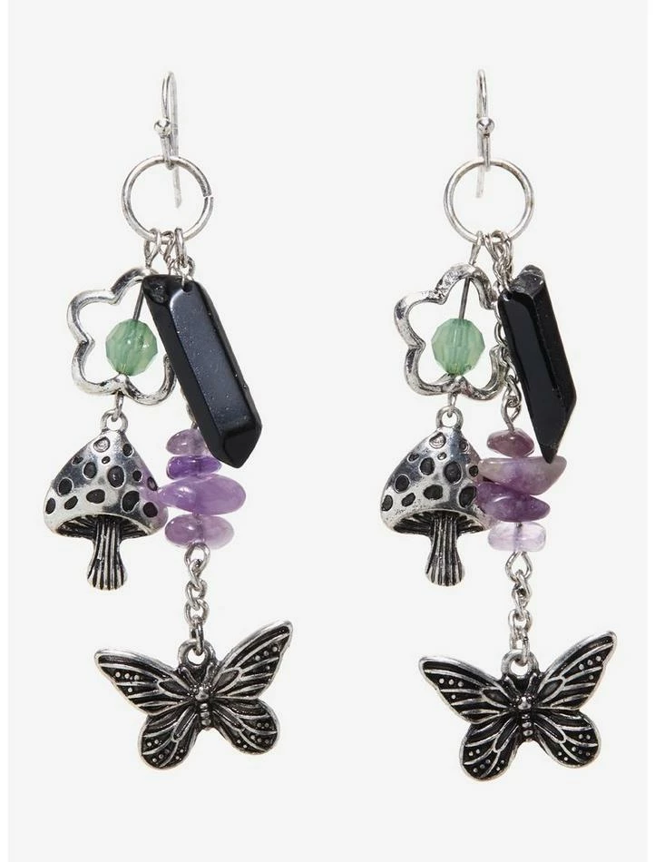 Channel some dark forest vibes with these charming earrings! Featuring antique silver-tone charms of mushrooms, flowers and butterflies, with a black faux crystal and rich faux gems throughout.