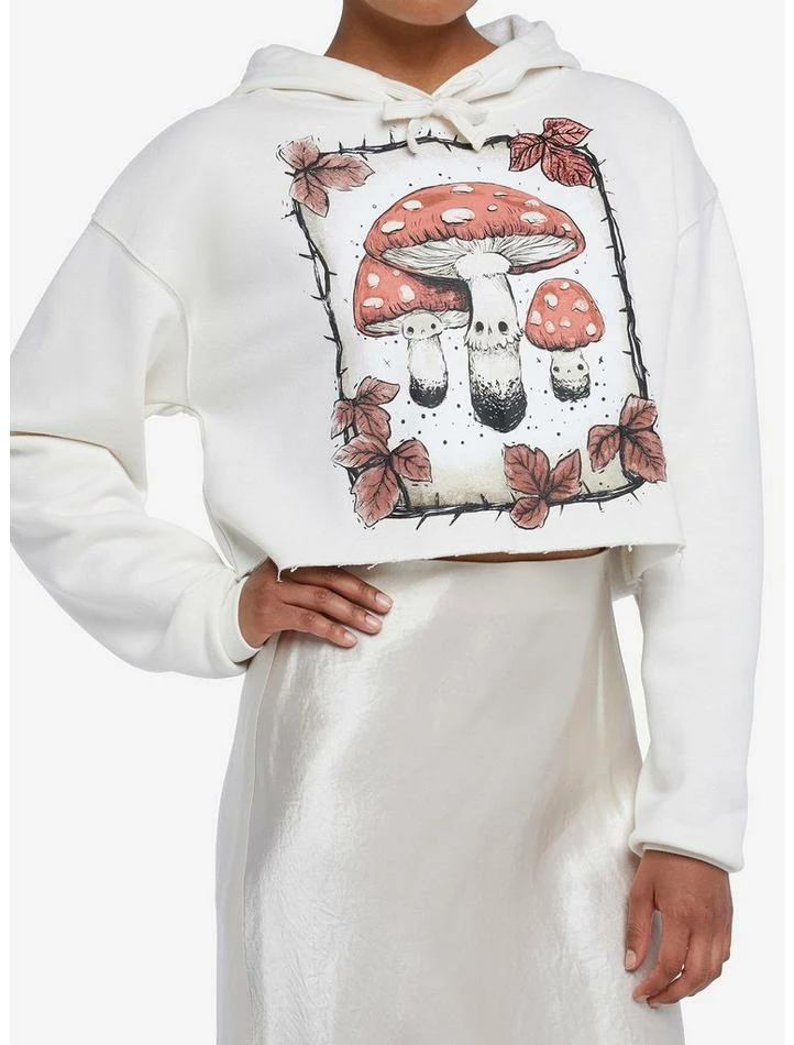 Make room for more mushrooms! This ivory hoodie features a graphic of three mushrooms within a thorns and leaves border and a cropped length.