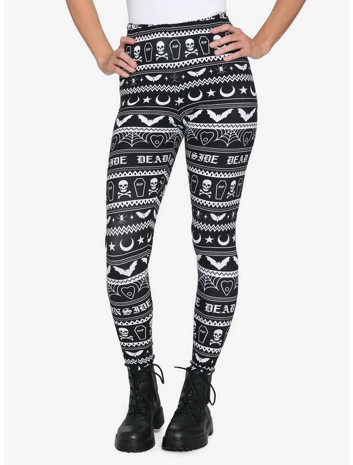 Creepy and cozy? Sign us up! These black & white leggings feature a Fair Isle-inspired design of bats, coffins, spiderwebs and more!