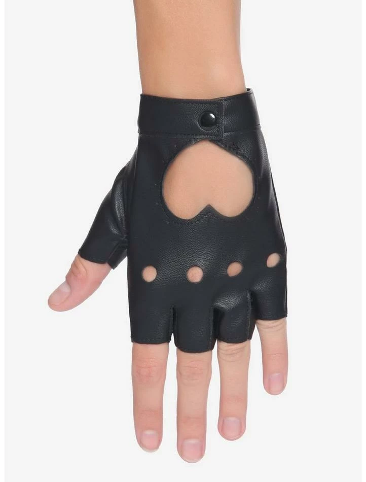 Add a lovely touch to your moto gloves. No motorcycle experience needed to wear these! These black faux leather gloves have a heart cutout design and a heart stitched into the palm side. Snap-button closure strap.