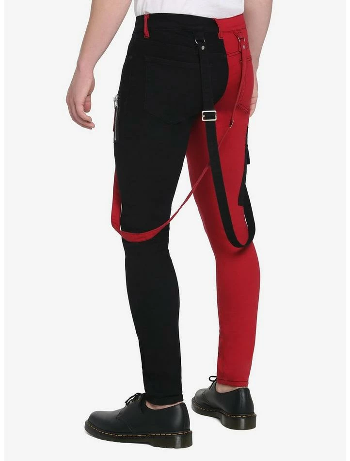 Make a statement in this pair of skinnies! We revamped our HT Denim Stinger jeans with a bold, black-and-red colorblocked design, detachable suspenders and lots of zippers. In addition to the standard 5 pockets, there is a flap pocket on the thigh.